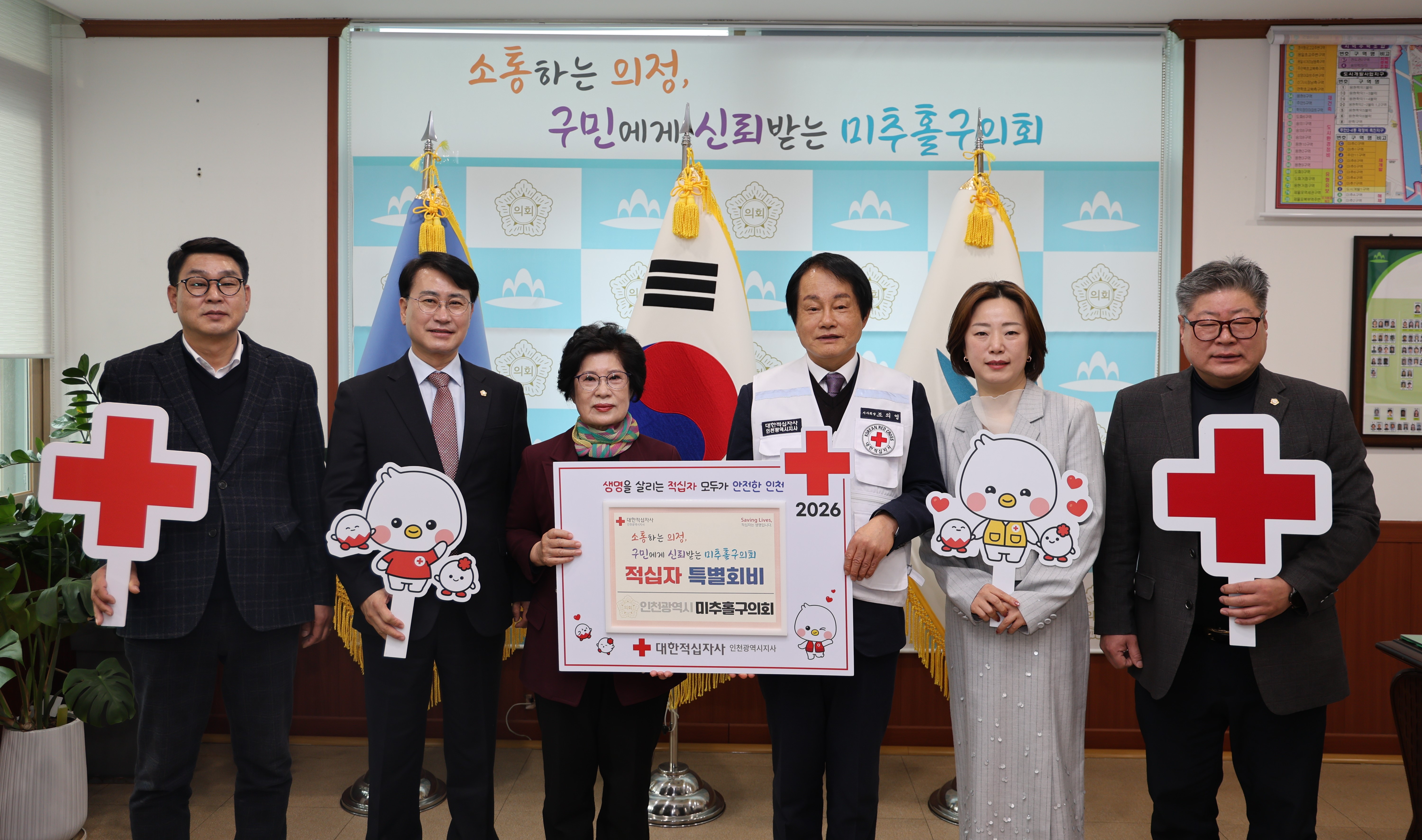 인천 미추홀구의회는 지난 2월 4일 의장실에서 전경애 의장과 장규철 부의장을 비롯한 상임위원장들과 조의영 대한적십자사 인천지사 회장 및 조혜정 적십자봉사회 미추홀지구협의회 회장 등 관계 임원들이 참석한 가운데 2026년도 적십자 특별회비 전달식을 개최했다.