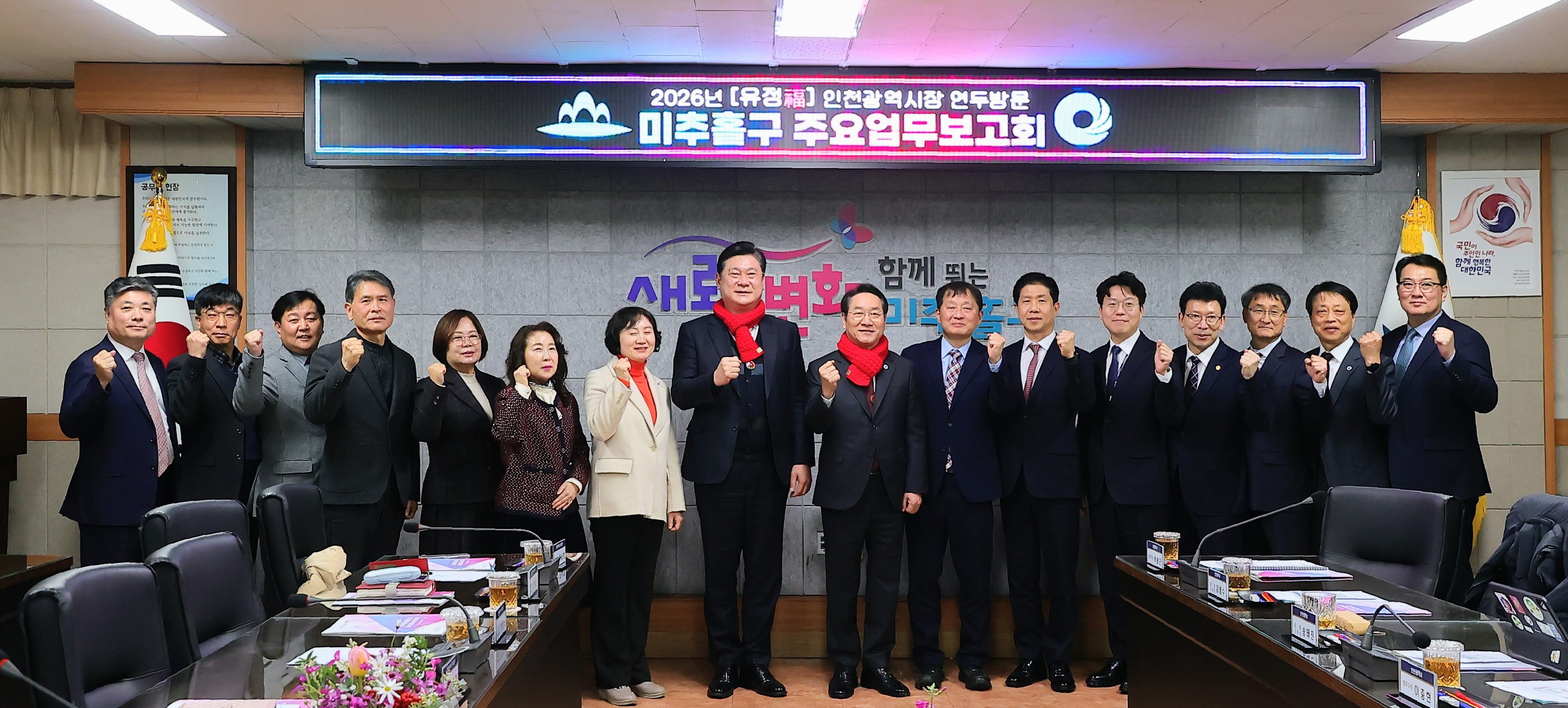 구청 본관 앞 환영 행사에서는 주민들이 직접 준비한 ‘마부정제’ 족자와 꽃 압화 목걸이가 전달되며 훈훈함을 더했다. 이어진 주요 업무보고회에서 이영훈 미추홀구청장은 구민의 숙원 사업인 6개 핵심 건의사항을 전달하며 시의 전폭적인 지원을 요청했다.